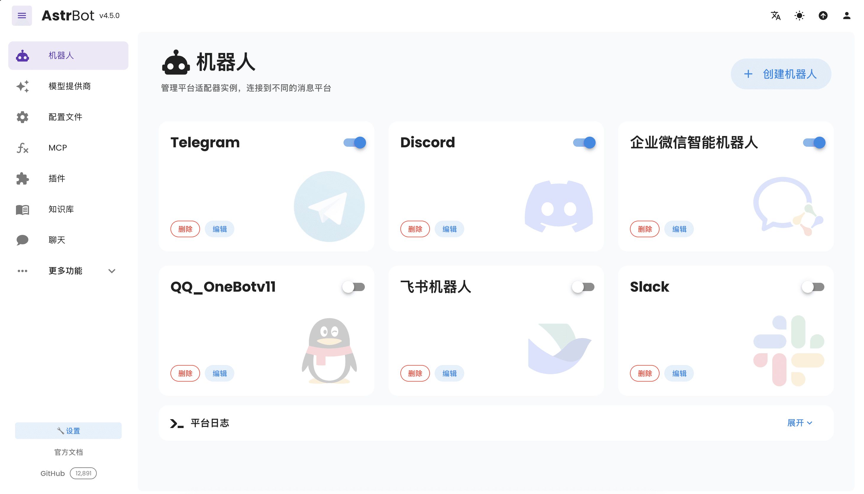AstrBot 内置支持接入到 QQ、企业微信应用、企业微信智能机器人、微信客服、微信公众号、飞书、钉钉、Telegram、Discord、Slack、Misskey、Satori 等多种消息平台。